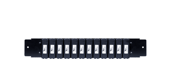 The surface or rack mount 12-way frame is suitable for Ethernet, power, or coax surge protector module installations