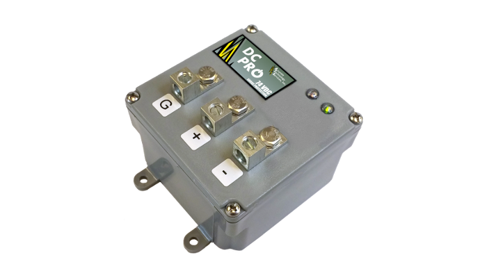 12V and 24V DC transient voltage surge suppressor within a durable, weatherproof PVC housing