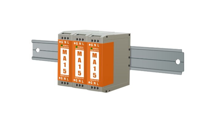DIN rail mounted 120VAC or 240VAC surge protector with filtering capabilities